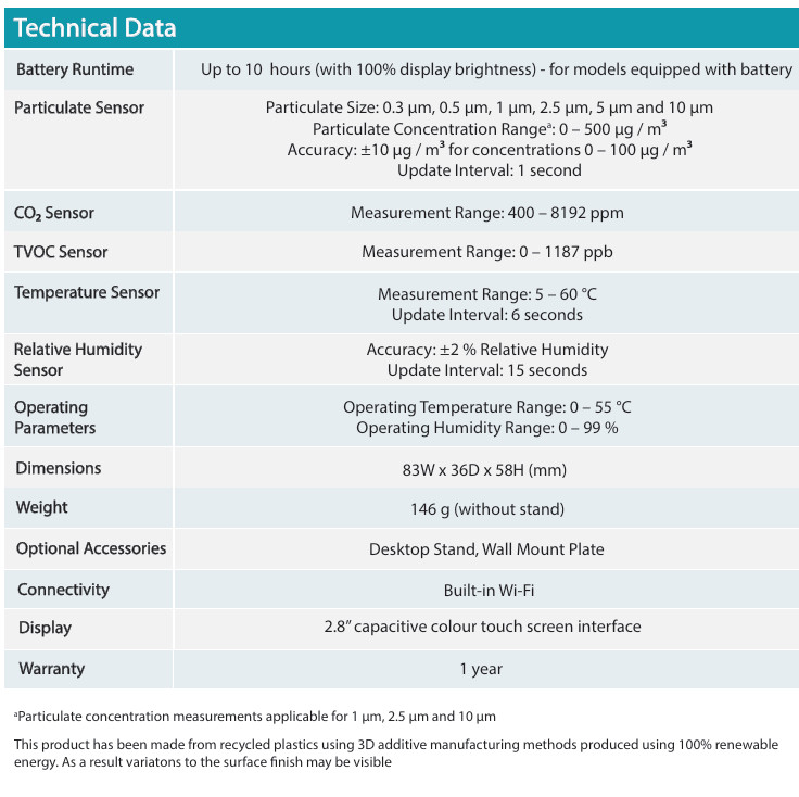 Includes: SENSEIQ 2 Air Quality Monitor (USB Powered Only - No battery), 1x USB Cable, 1x USB Wall Adapter